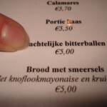 Oh, wacht… hier heb ik nog een anekdote bij… Alvorens een concert bezochte we in 2011 (Laaglandische jaartelling) een peuzelkroeg in het Laaglandische Uden en De Prinses sloeg werkelijk stijlverbijsterd achterover: grote menukaarte sierde de mure maar van werkelijk iedere menukaart spronge de taalfoute je in de oge! Wauw! De avond van DP kon niet meer stuk en ze begon vrolijk bovestaande foto’s te make voor haar verzameling. Desgevraagd door de eigenaar wat ze eigelijk aan het doen was begon DP hulpvaardig en vriendelijk een taalLesje te geve en alle menukaarte te duide. De Prinses kwam op stoom, maar hoe enthousiaster de tekst en uitleg van DP, hoe bewolkter het gezicht van de nijveraar. Helaas beheerste hij het Laaglandische Nederlands niet zo en kwam warempel tot de conclusie dat wij voor een concurrent zijn menu’s aan het kopieerde ware. Stupéfait en verbouwereerd kreeg De Prinses in de gate dat haar goedbedoelde hulpvaardigheid de stemming van de uitbater naar een dieptepunt deed duikele waarop we foetsievlug afscheid name om de rest van onze peuzels maar buite in het donker weg te gaffele. “Meuh… wij wilde alleen maar helpe”, aldus een beteuterde Prinses…